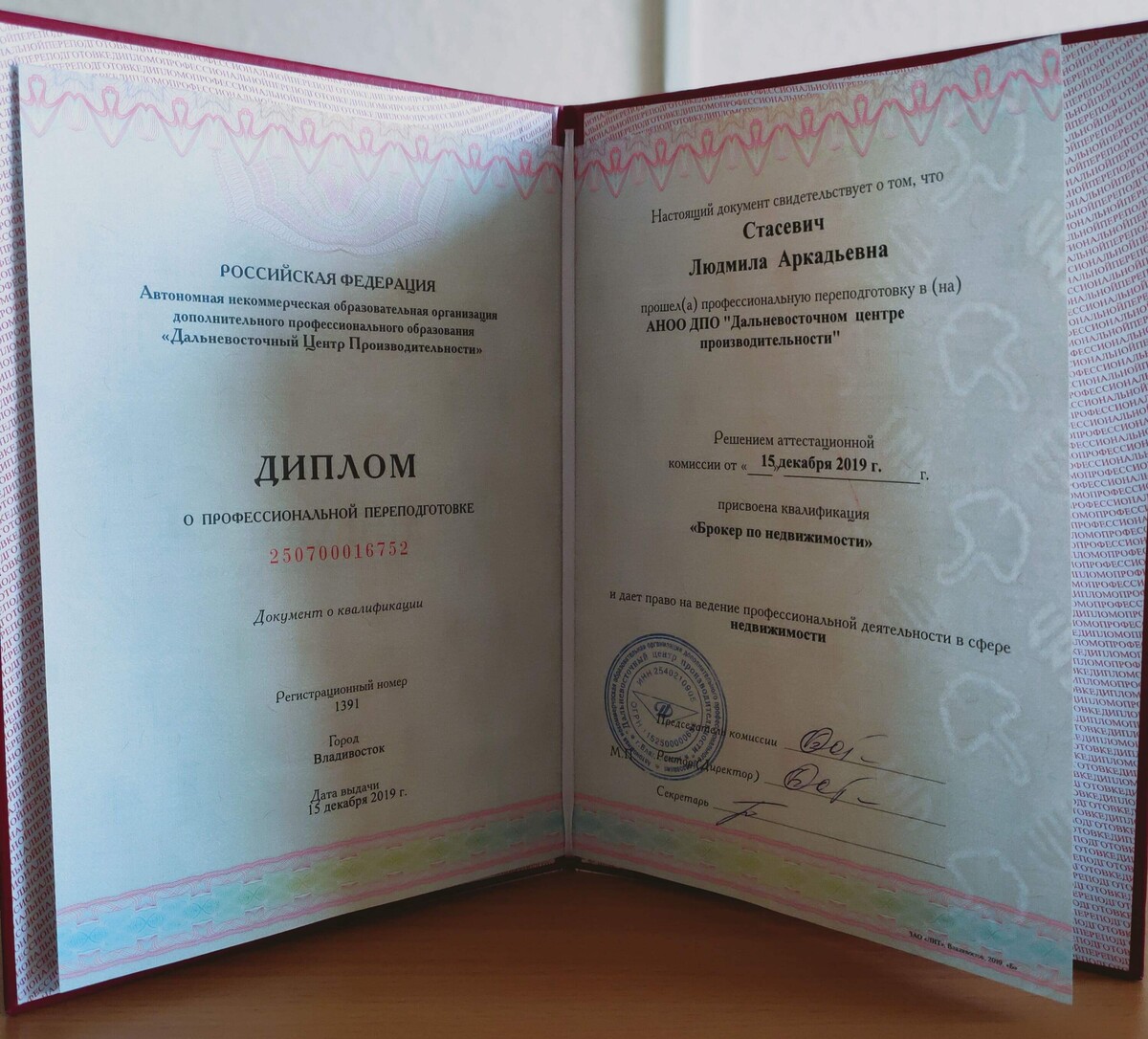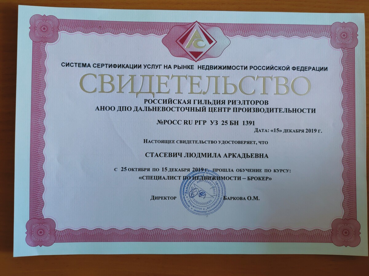 диплом о профессиональной переподготовке "брокер по недвижимости" И СВИДЕТЕЛЬСТВО СИСТЕМЫ СЕРТИФИКАЦИИ УСЛУГ НА РЫНКЕ НЕДВИЖИМОСТИ.