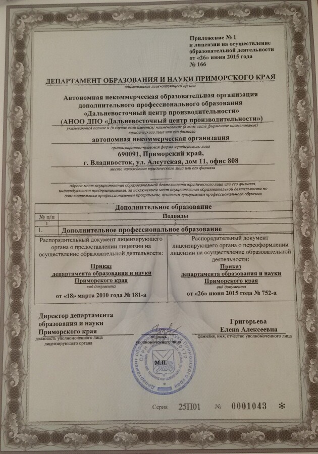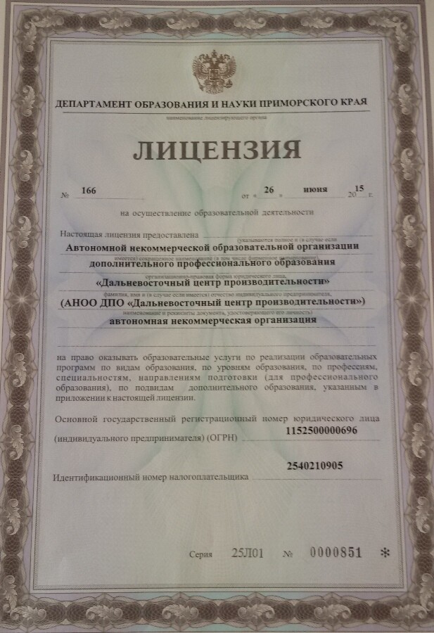 консультант управления, сертифицированный Японским центром производительности (Япония, Токио). Опыт консультирования и проведения семинаров на предприятиях Приморского края, г. Москвы, г. Хабаровска, г. Комсомольска–на Амуре,