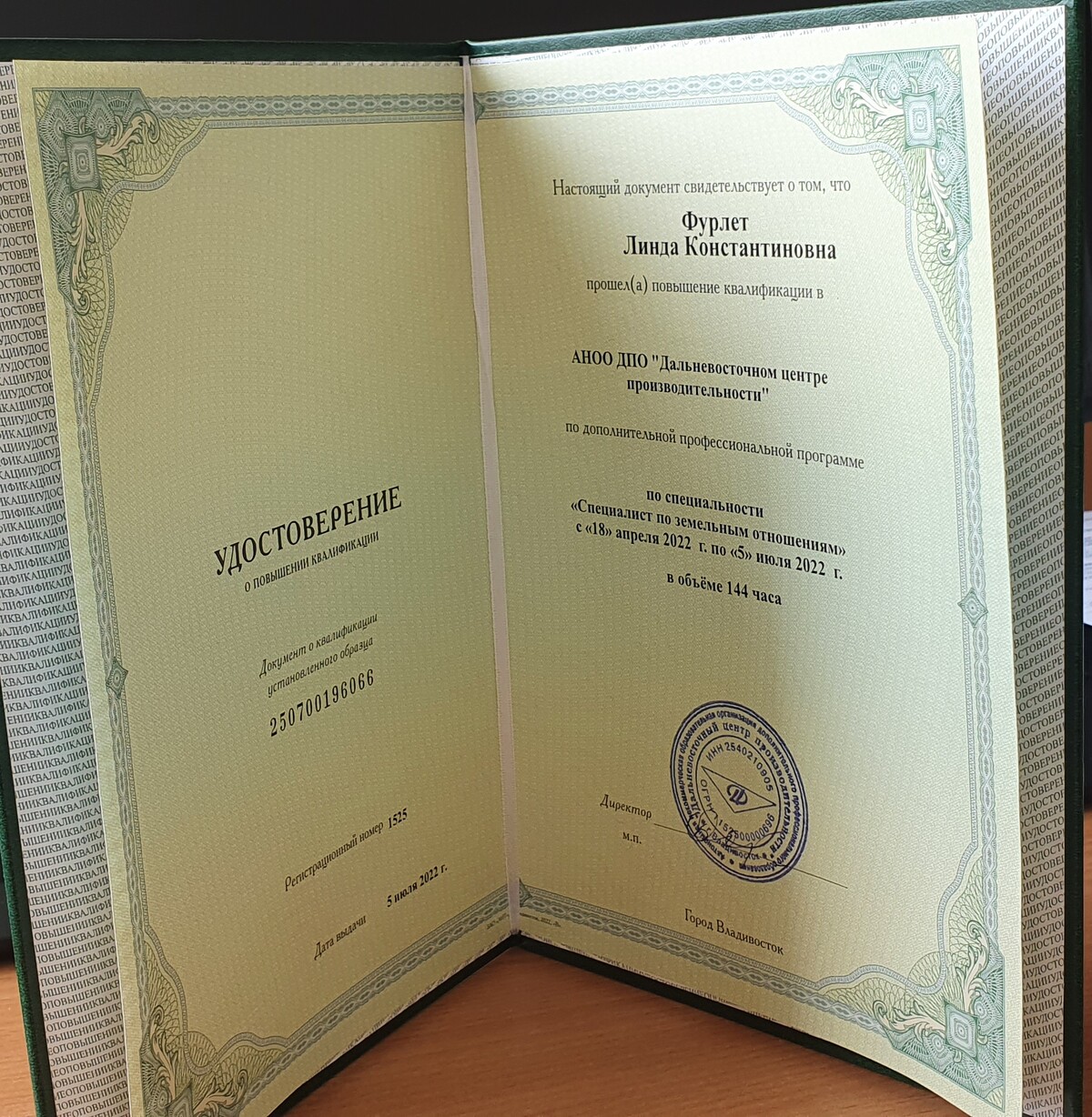 После окончания онлайн курса "Земельный брокер" вы получаете: Удостоверение О ПОВЫШЕНИИ КВАЛИФИКАЦИИ ПО СПЕЦИАЛЬНОСТИ "Земельный брокер"